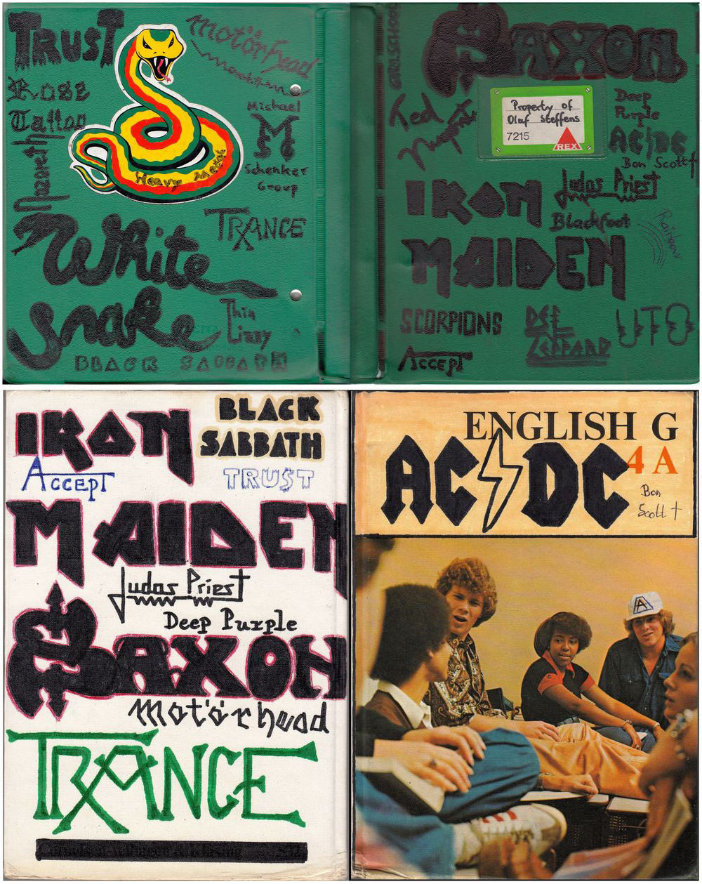 Property of Olaf Steffens. Zwei original erhaltene Zeitzeugnisse aus meiner Schulzeit mit mehr oder weniger kunstvoll selbst aufgemalten Band-Logos. Einmal einer meiner Schulordner, den ich zudem noch mit einen Schlangenaufkleber versehen habe. Den Aufkleber habe ich an einem Kirmes-Schießstand als Preis für einen Volltreffer (nach unzähligen Fehlschüssen) erhalten. Dazu noch ein Englischbuch mit zum AC/DC-Cover umgestalteter Titelseite (man beachte den Typen auf dem Bild mit Angus-Young-Kappe) und zur Komplettierung mit weiteren Band-Schriftzügen auf der Rückseite. Meine Lehrer waren begeistert!
