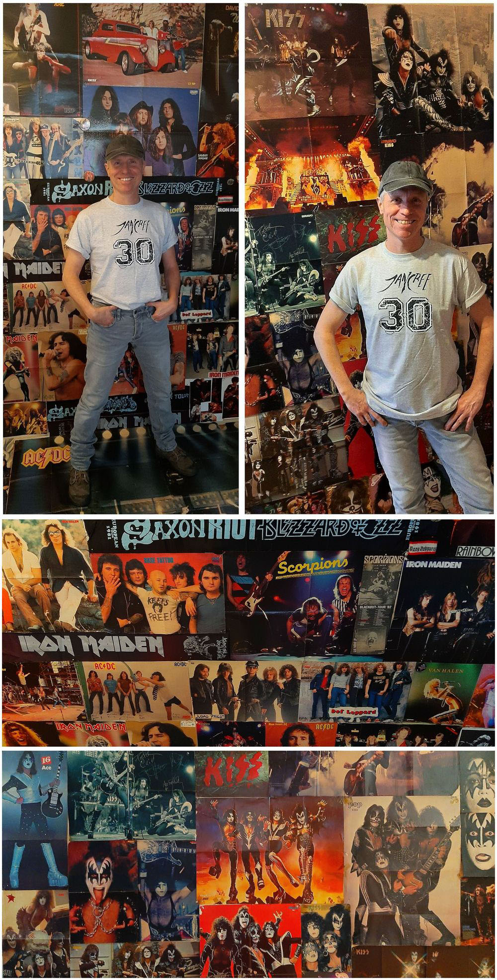 Eines der von Markus Drangsal perfekt umgesetzten Layout-Elemente der Fotodoppelseiten im Kapitel Stop.Rewind.Play! Hier Fotos von der Foto-Session, die meine Frau Sylvia gemacht hat und die mich vor Teilen der rekonstruierten großflächigen Poster-Wänden zeigen. Alles Originale aus meinem damaligen Hard-Rock-Kid-Zimmer in Ludwigshafen-Oppau, die tatsächlich die Jahrzehnte in zwei Plastikboxen überdauert haben und einen kleinen Eindruck gewähren, wie mein Zimmer Ende der Siebziger, Anfang der Achtziger dekoriert war. Als hätte ich geahnt, dass die Poster irgendwann noch gebraucht werden. Um die gelungene Zeitreise während der Foto-Session akustisch zu umrahmen und perfekt zu gestalten, lief im Hintergrund das Kiss-Album Double Platinum.