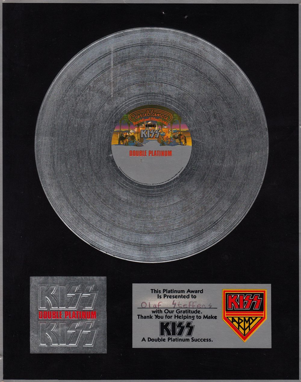 Für meine Verdienste um die „Gründung der „Kiss-Army-Oppau“ mit aufopferungsvoller Investition meines gesamten Taschengeldes in Poster, Platten und T-Shirts und der Überzeugungsarbeit bei meinen Freunden in Schule und Nachbarschaft“ bekam ich also meine erste (und bisher einzige) Platin-Platte vom Kiss-Management. So oder so ähnlich hätte die Laudatio meiner Meinung nach mindestens ausfallen müssen. Zumindest gab's die Platin-Scheibe im Cover des gleichnamigen Kiss-Doppel-Albums und ich war auch so rundum glücklich.