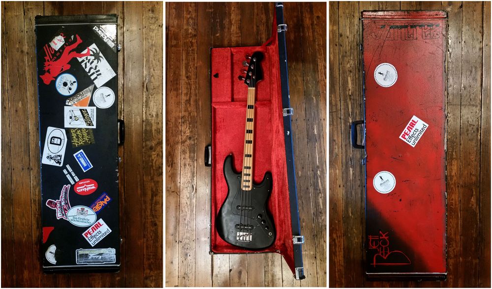 Mein erster Bass! Hier mein im Buch beschriebener erster Bass: die legendäre Fender Jazz-Bass-Kopie aus den späten Siebzigern zusammen mit meinem ersten Bass-Koffer und den vielen alten Stickern drauf. Den Bass habe ich später, etwa Mitte der Achtziger, zum Fretless-Bass umgebaut. Die Bünde bzw. die Bundstäbchen entfernt, den Hals und Korpus abgeschliffen und anschließend schwarz lackiert. Sieht cooler aus, als er klingt. Der Bass kam deshalb nur ein- oder zweimal auf der Bühne zum Einsatz und nie im Studio. In dieser Version diente er mir lediglich als Übungsbass für Fretless-Techniken.