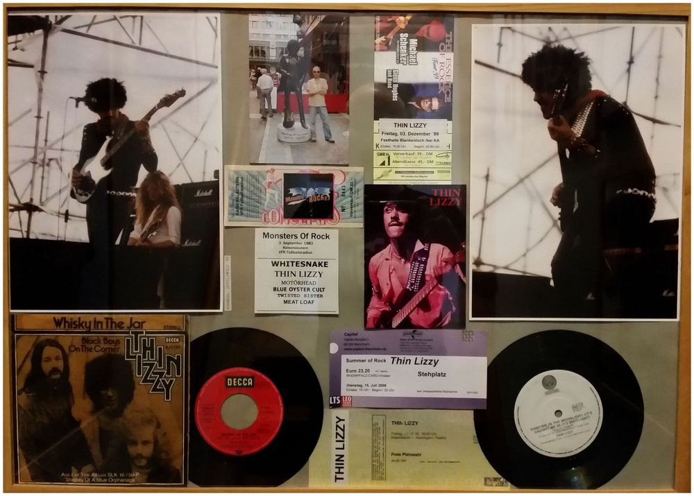 Der Thin-Lizzy-Rahmen. Einige Originale und Unikate rund um die irische Kult-Band. Tickets von Lizzy-Konzerten, die Original-Single „Whiskey In The Jar“ mit Cover und die Single „Dancing In The Moonlight“ ohne, Fotos von mir auf den Spuren von Phil Lynott in Irland und zwei Fotos, die Klaus Schmid beim letzten Konzert von Thin Lizzy in der Besetzung mit Lynott am 04.09.1983 auf dem Nürnberger Zeppelinfeld mit seiner Olympus gemacht hat. Geniale Schnappschüsse von Phil Lynott und John Sykes. Und welch grandioses Geschenk!