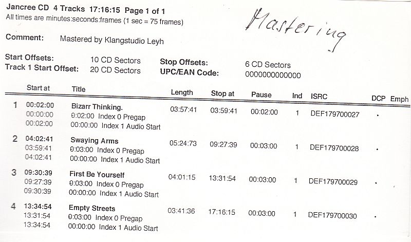 Danach wurden die Aufnahmen ins "Klangstudio Leyh" nach Sandhausen geschickt und dort von Markus Born gemastert, bei dem Jancree bereits 1988 und 1989 in seinem damaligen Ludwigshafener Studio ihre ersten professionellen Demos aufgenommen haben.