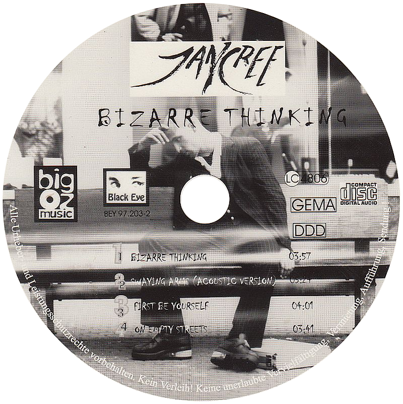 The choice for the four numbers of "Bizarre Thinking" fell on one electric and three acoustic songs. The band had already been working on an "Acoustic Set" some time ago, had been playing it live successfully (see also the facts about "Jancree unplugged") and thus had written an acoustic version of "Swaying Arms" and the songs "First Be Yourself" and "On Empty Streets". As the opener, Jancree had chosen the title song "Bizarre Thinking", which was also already live tested and very well received by the audience. Jancree have remained faithful to their previous style, but once again they had made an enormous development in their songwriting and opened another stylistic door with the acoustically oriented songs.