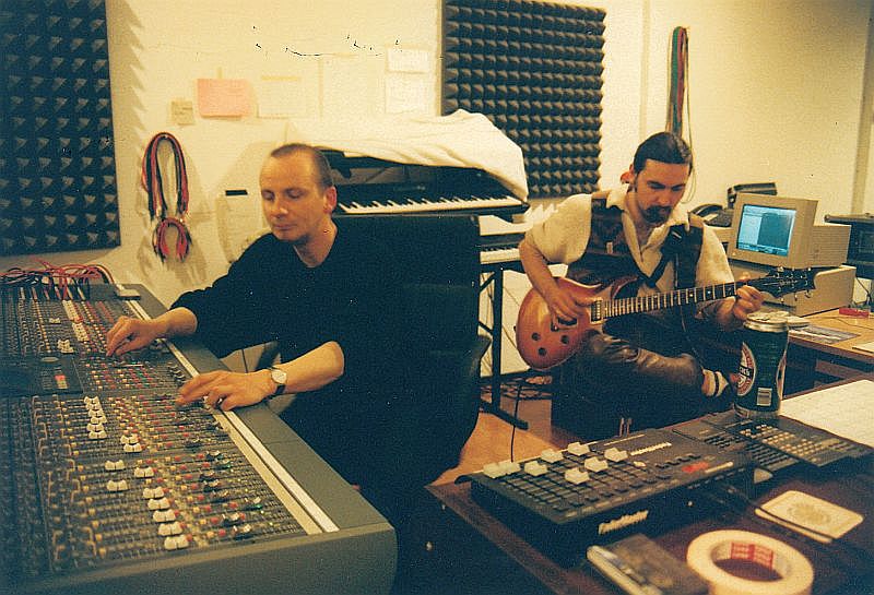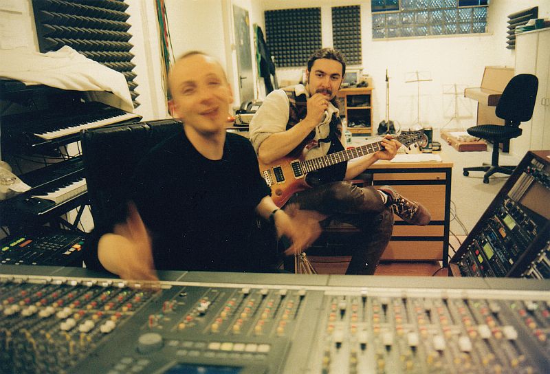 Chris Oz and Michael Kipp during the recordings of the guitar overdubs for the track "Bizarre Thinking".