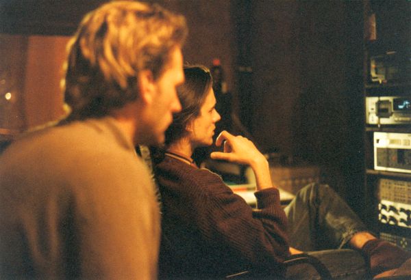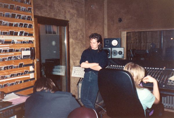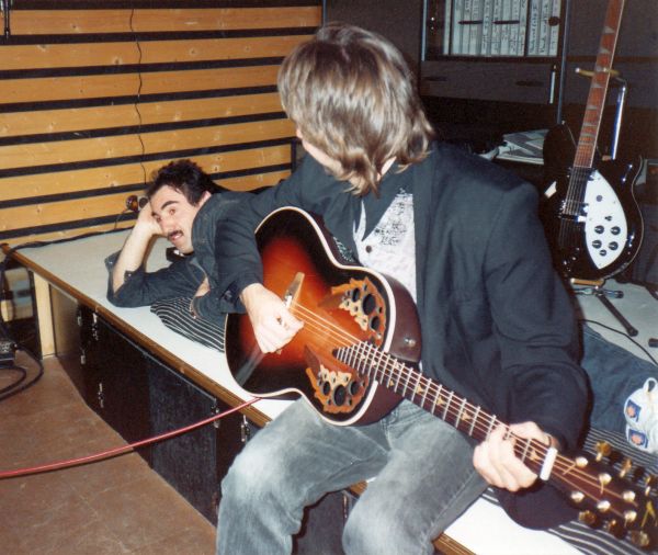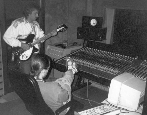 Andreas Klar in the control room during overdub recordings with the 12 string Rickenbaker. On mixing desk: audio engineer Jochen Sachse.