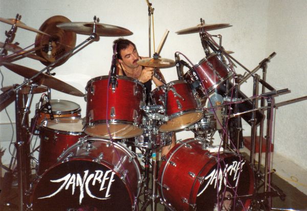 Klaus Schmid during a recording break behind his 90s 'Neil Peart' like drum set.