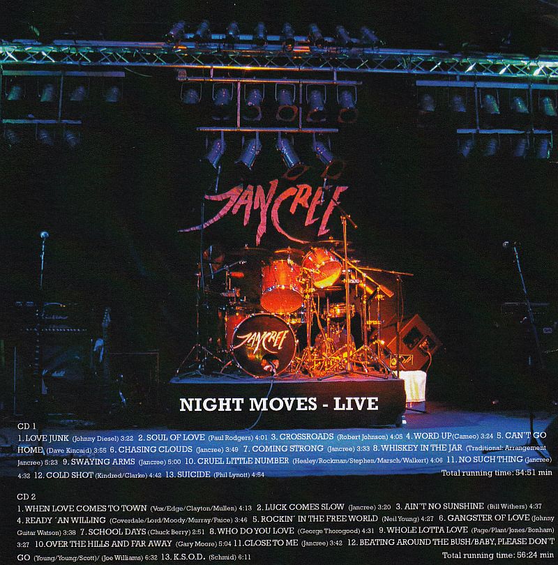 Ihr exzellentes Doppel-Live Album "Night Moves" zeigt nicht nur ihre intensive Live Power indem sie hervorrangende Interpretationen von Songs vieler großer Rock Legenden und ihre brillianten eigenen Lieder spielen, es vermittelt dem Hörer zudem eine Idee, wie es sich anfühlt, wenn man bei einem Jancree-Konzert live dabei ist.