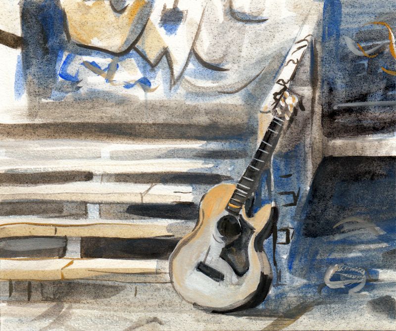 The Heidelberg artist Kirsten Waack, who was a friend of the band, had the idea of interpreting one of the original black and white photos with watercolor and dividing them into three parts, after having looked through a pile of photos from the album photosession. She has also created the backcover with the acoustic guitar as well as the CD print according to her own ideas. To this end, Layouter Jochen Groer from the House Audio Studio later put the matching photos of photographer Joe Vetter and the lyrics into the booklet. An absolutely successful cover artwork was created as a result and everyone was enthusiastic about it.