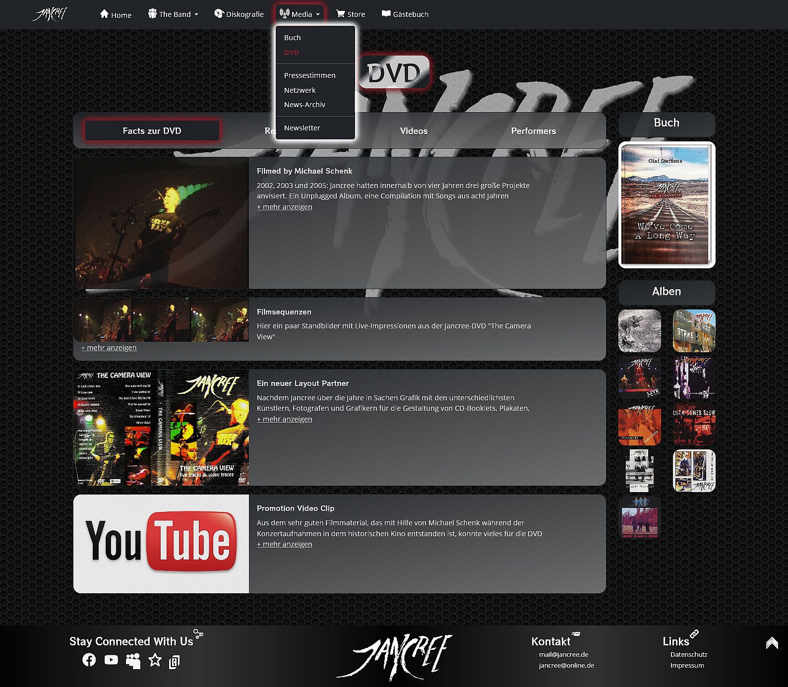 Erstmalig werden nun auch alle bisherigen Jancree-Line-ups chronologisch mit allen Band-Mitgliedern ausführlicher beleuchtet und online vorgestellt. Die komplette Diskografie mit den jeweiligen Songs und allen Facts zu den jeweiligen Alben haben ebenfalls einen gebührenden Platz erhalten und bieten einen guten, visuell spannend umgesetzten Überblick über das Schaffen der Band. Ergänzt durch englische Übersetzungen. Dazu gibt es eine große Fülle an Presseberichten, Stories zum Buch und der DVD, das Jancree-Netzwerk und natürlich den ebenfalls aktualisierten und runderneuerten Jancree-Store mit zusätzlichen Verlinkungen auf alle Download-Portale und Streaming-Dienste. Abgerundet wird die Homepage durch ein News-Archiv für alle Jancree-Hardcore-Fans (oder solche, die es werden wollen) und ein virtuelles Gästebuch, in das ihr Euch gerne eintragen könnt.